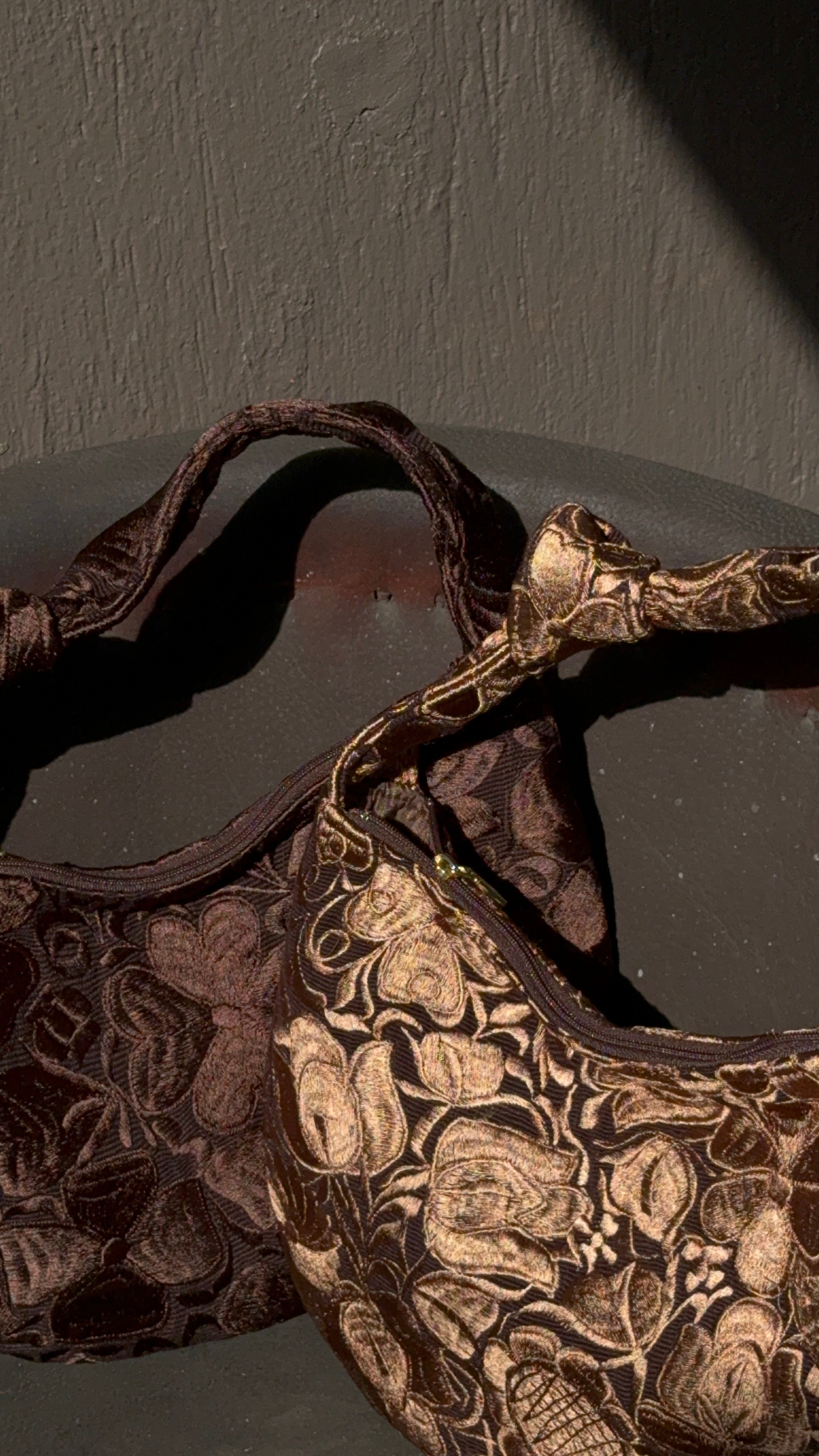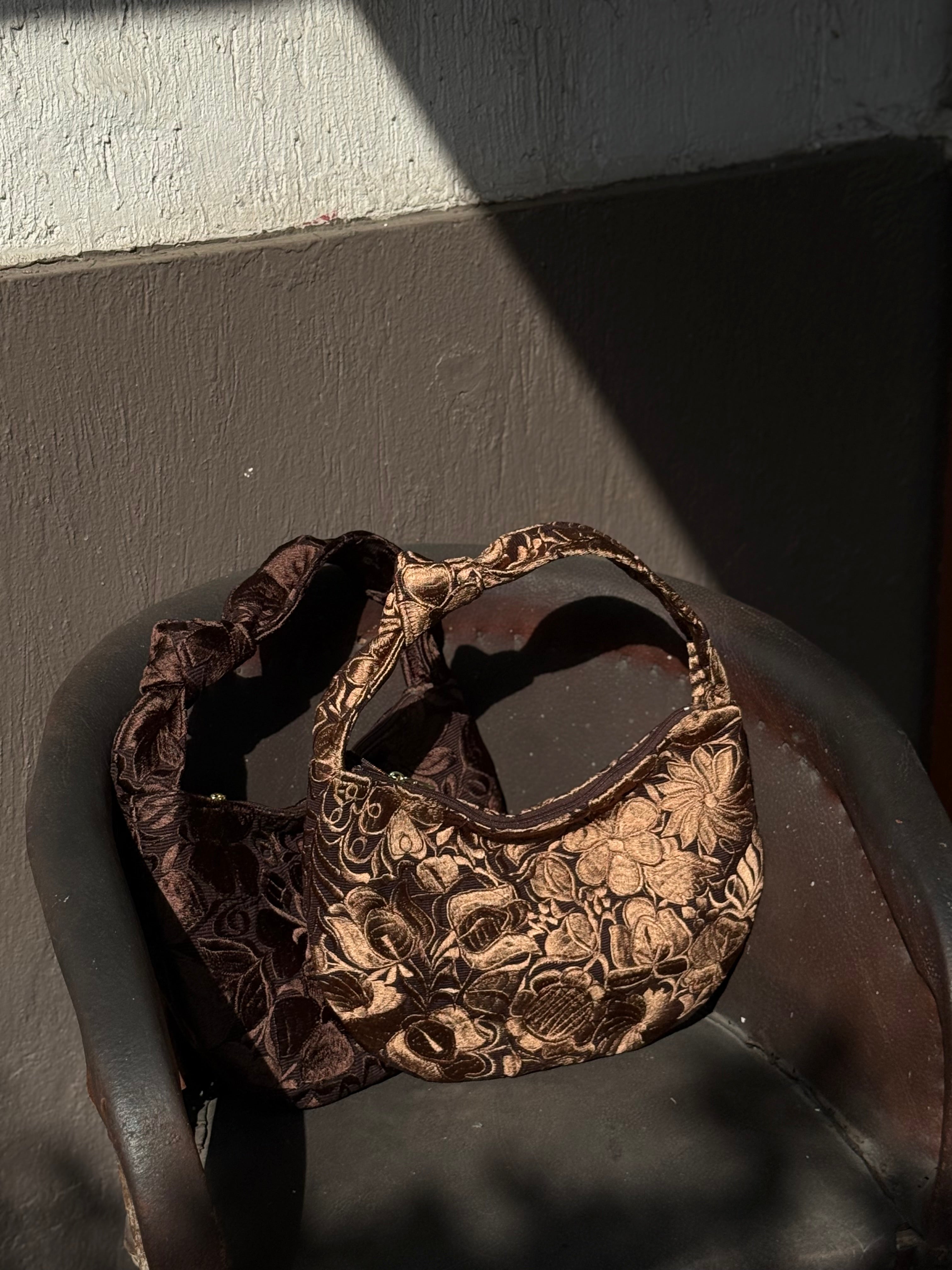 Caramelo, warm brown embroidery on chocolate brown canvas.